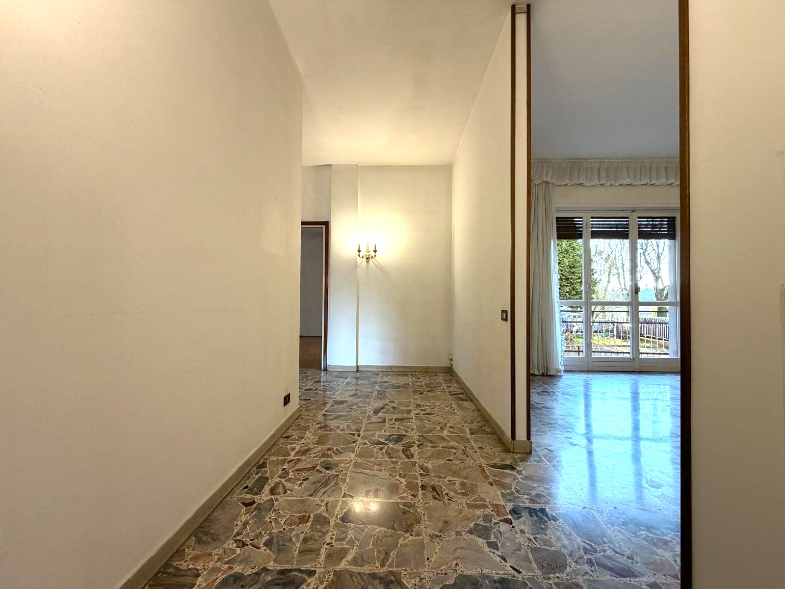 L’unità immobiliare si sviluppa con un ingresso che conduce, sulla sinistra, alla cucina abitabile, separata e funzionale. Proseguendo si accede al soggiorno, di buona metratura, con uscita diretta su balcone. Un disimpegno collega la zona giorno alla zona notte, garantendo una corretta distribuzione degli ambienti.